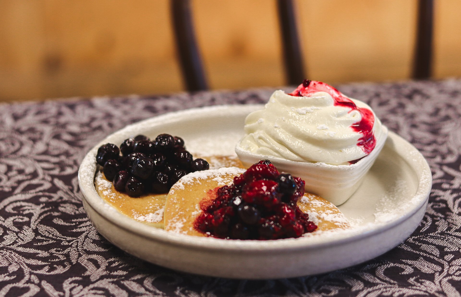 Hot fluffy pancakes served with whipped cream and berries.